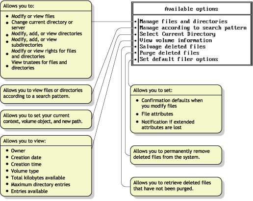 This legacy DOS utility can be used at a workstation to manage files and directories on NSS for NetWare volumes. FILER works with the file system; it doesn't affect eDirectory objects.