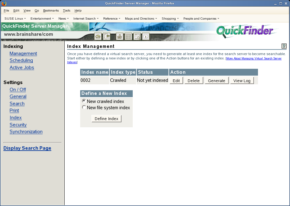 After you define an index, you must generate it before it can be used for searching. Generating an index is the actual process where QuickFinder Server examines file server or Web server content, gathers keywords, titles, and descriptions and then includes them in the index.