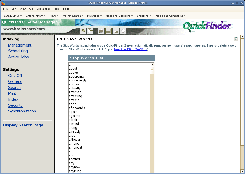 You can add or remove words from the Stop-Words list. QuickFinder Server uses this list to determine which words it ignores in a user's search string. QuickFinder includes a predefined list of stop words, but you can edit or change these at any time.