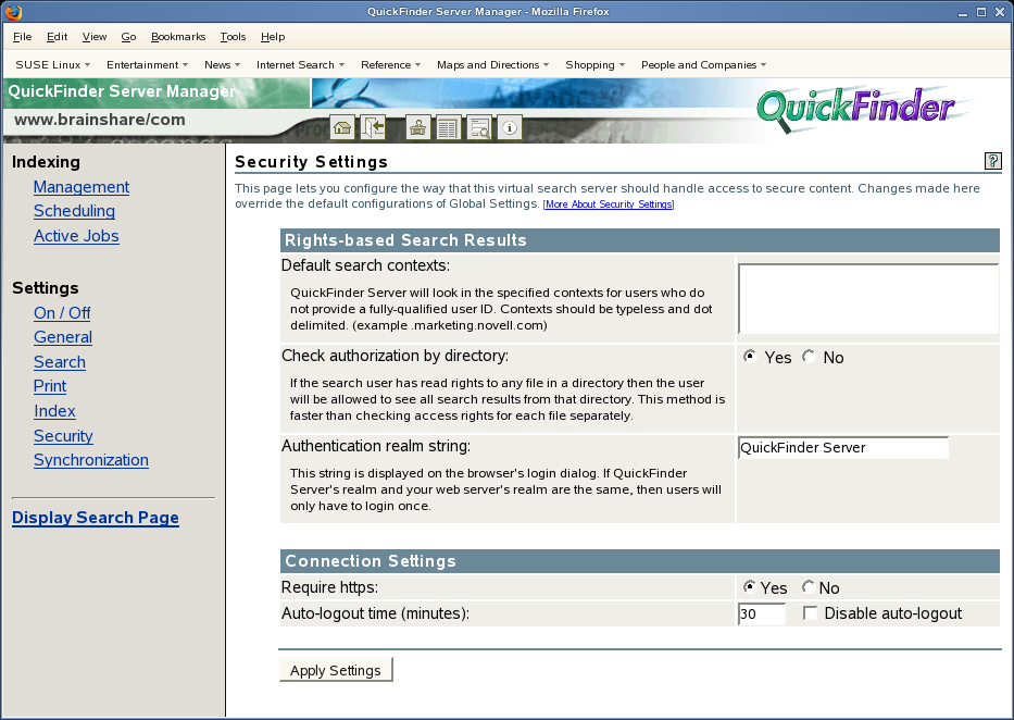 Security settings let you manage access to indexed content by requiring users to authenticate to a server before seeing rights-protected search results. The Security Settings page lets you configure rights-based search results and specify secure connection settings, including enabling the HTTPS protocol for securing usernames and passwords as they are sent over the network.
