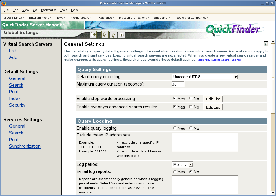 On the QuickFinder Server Manager's Global Settings page, click under .