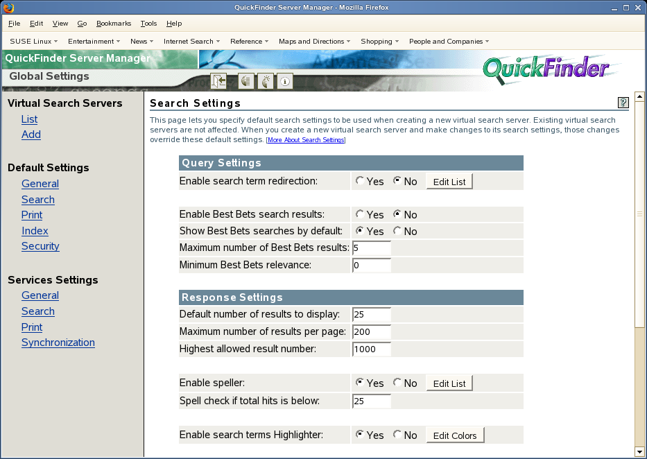Default Search Settings lets you modify default search query, response, and template settings for all new virtual search servers.