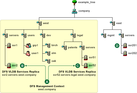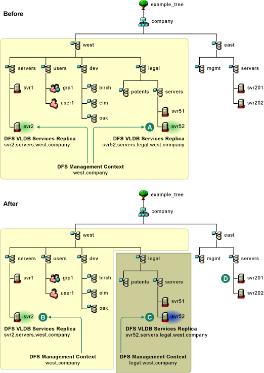 In both of the same-subtree examples, if you delete the lower-level DFS management context (legal.west.company), the VLDB service on its replica server (svr52.servers.legal.west.company) are stopped and its VLDB is deleted. The higher-level management context automatically expands to include the lower-level subtree. A VLDB repair adds the volumes in the subtree to the VLDB. When the repair is completed, junctions that point to volumes in the legal.west.company subtree continue to work normally.