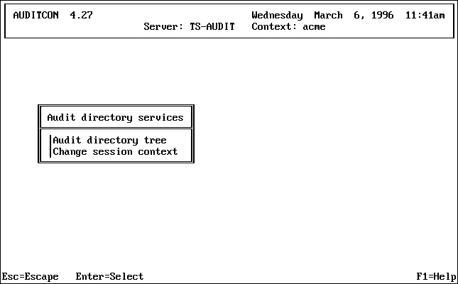 AUDITCON will change your NDS context and update the context field in the display header area. It will then display one of the top-level menus (see Top-Level Menus).