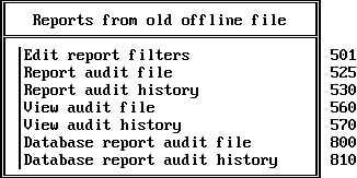 Choose Database report audit file from the Reports from old offline files menu (602).