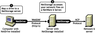 In this scenario, NetDrive lets you use Internet friendly protocols (WebDAV over HTTP) to map a drive to a NetWare server through NetStorage. NetStorage uses NCPTM to access the NetWare server, reads your login script, then displays all of your mapped drives and files from one central location.