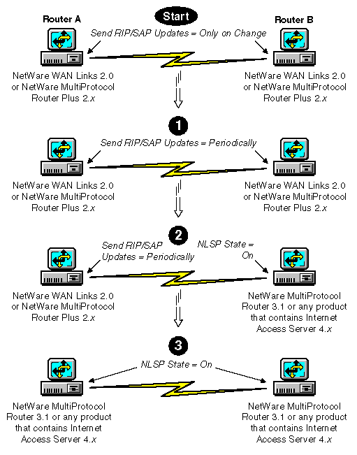 NOTE: You can upgrade routers on each end of a WAN connection one at a time. Simultaneous upgrades are unnecessary; NLSP runs RIP and SAP automatically until you have upgraded both routers.