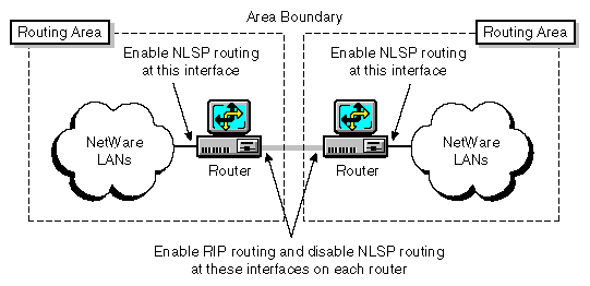 Do not enable NLSP on the interfaces at area boundaries. Two routers running NLSP at an area boundary automatically become neighbors and join their respective areas into a single area. Run only RIP at an area boundary, as shown in Figure 3. However, a router in one area can run NLSP on a transit LAN while routers to other areas run RIP. An example of this is shown in Partitioning an Internetwork That Uses a Transit LAN.