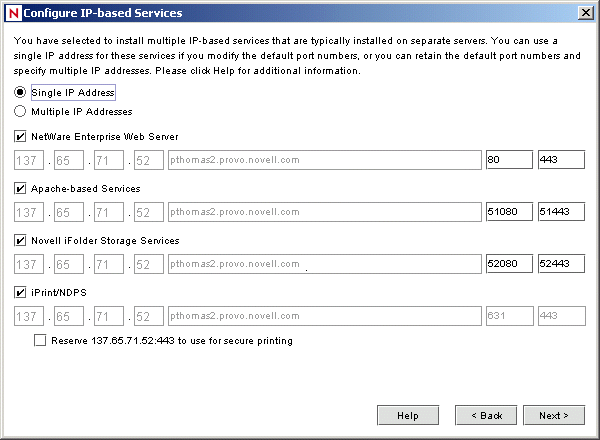 The following figure shows the Port Resolver dialog in Single IP Address configuration mode. This example shows all four of the services (or service groups) managed by Port Resolver, namely, NetWare Enterprise Web Server, Apache-based Services (NetStorage, NetWare Web Access, and NetWare Web Search), Novell iFolder Storage Services, and iPrint/NDPS.