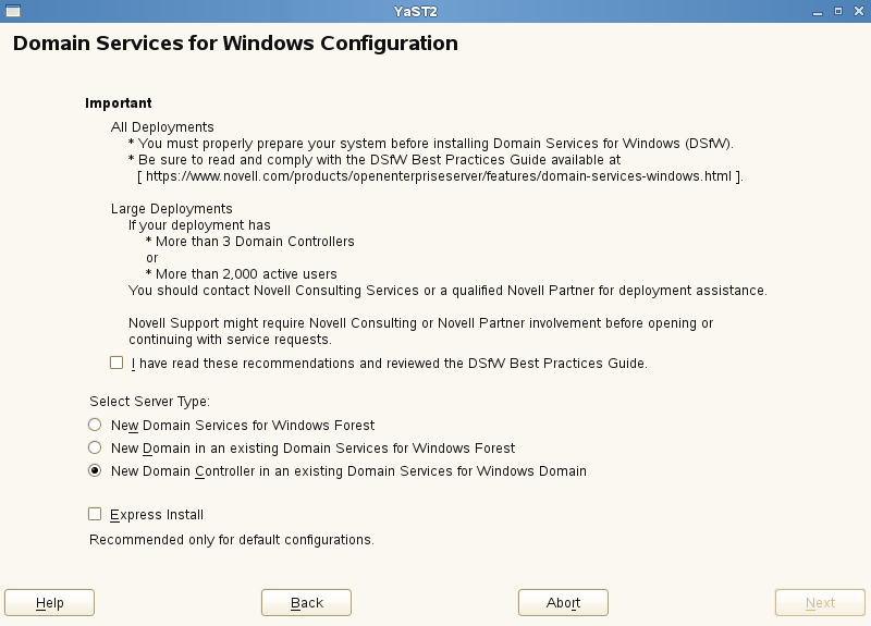 Select the Express Install option to deploy a domain controller by automatically populating certain YaST configuration fields. For more information, see Section 6.1.3, Express Installation.