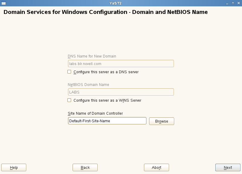 Site Name of Domain Controller: Default-First-Site-Name is specified as the site name by default. To create a new site, specify the site name or click Browse to specify a site from the list of sites. For more information about sites and subnets, see Section 16.0, Configuring Sites and Subnets.