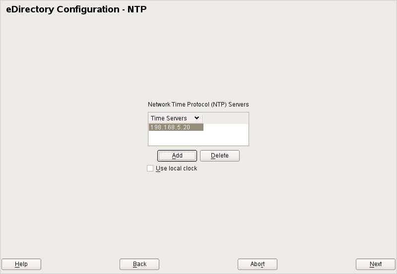 eDirectory requires that all servers in a tree be time-synchronized. To add multiple time servers to the list of NTP servers, click the Add button and specify the IP address or DNS host name of the NTP server. In a single-server scenario, you can select the Use local clock check box and specify the local machine as the NTP provider.