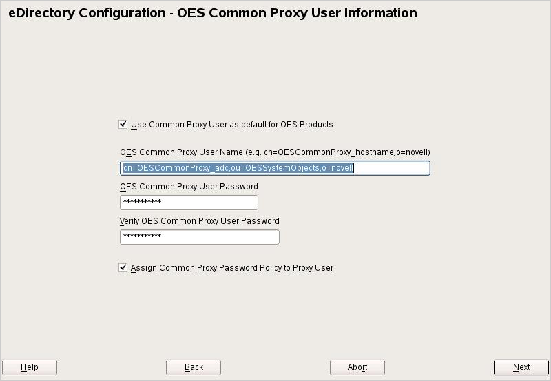 If you selected the Use Common Proxy User as default for OES Products check box in Step 16.a, the proxy user and password fields are populated with common proxy user name and password.