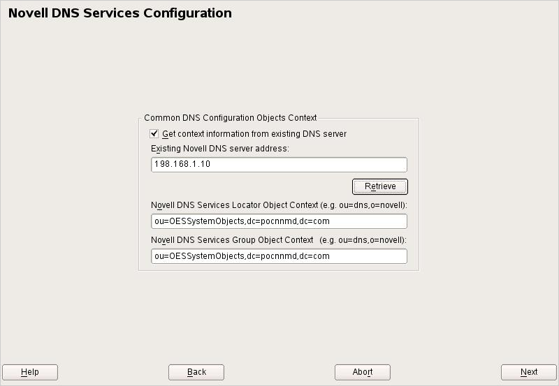 If you are configuring DNS in an existing tree where DNS is already configured, select the Get context and proxy user information from existing DNS server check box. Specify the IP address of an NCP server hosting the existing DNS server and click Retrieve. This retrieves the Locator, Root Server Info, and Group contexts.