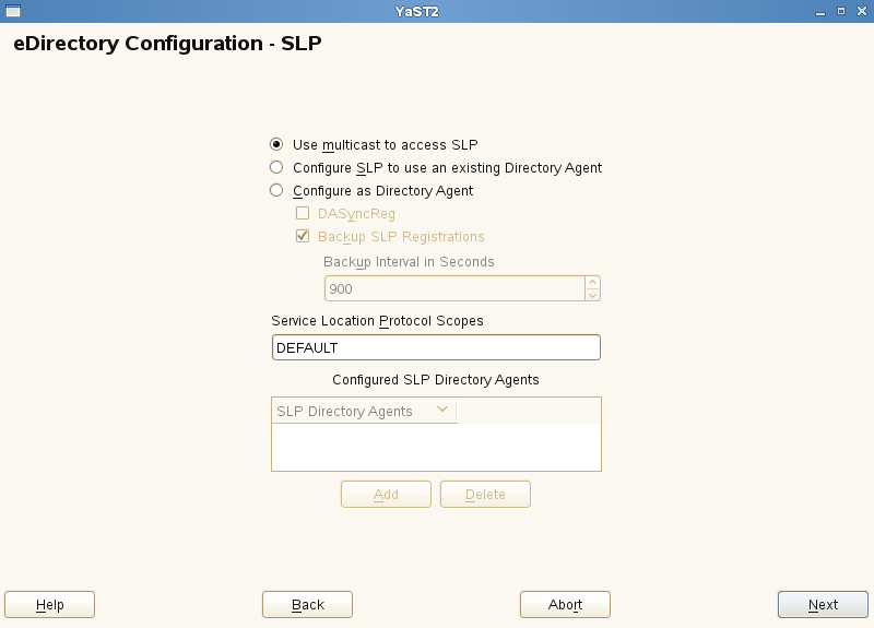 Configure SLP to use an Existing Directory Agent: If you have more than three servers in your eDirectory tree, and you already have a Directory Agent running, select the Configure SLP to use an existing Directory Agent option.