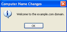A welcome message is displayed after the computer has successfully joined the domain. Click OK to continue.