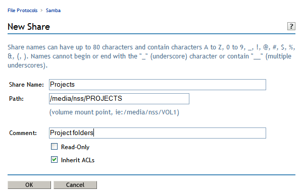 The example shown above creates a Samba share called Projects for the NSS volume named PROJECTS. The share name and volume name do not need to be the same, but making them identical can make share management easier. If you want, you can enter a more complete description of the share in the Comment field.