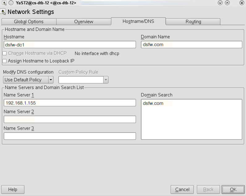 Before installing DSfW, ensure the domain name is entered correctly in YaST. To verify and correct the domain name, do the following: