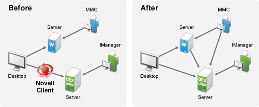 DSfW allows Microsoft Windows users to work in a pure Windows desktop environment and still take advantage of some OES back-end services and technology, without the need for a Novell Client on the desktop.