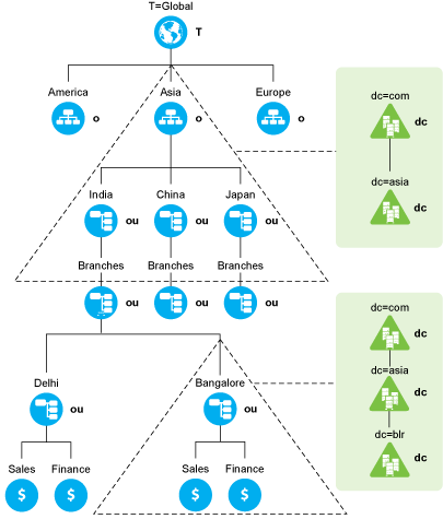 As illustrated in Figure 4-7, a domain named asia.com is created which is mapped to the partition o=asia. Now, you can map the partition ou=bangalore to a child domain named blr.asia.com, by excluding the partitions between the domains asia.com and blr.asia.com. The child domain excludes the partition ou=branches. This provides you with an advantage of avoiding an unnecessary server addition and its management in order to maintain the hierarchy.