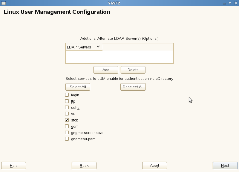 IMPORTANT:Setting up Linux User Management requires administrator rights to the container where the Linux User Management objects are created. For more information on rights, refer to Rights Required for Subcontainer Administrators