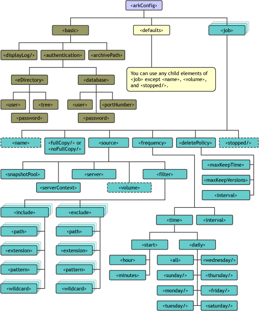 For information about these child elements, see the Job element (<job>) in this table. The Defaults element can contain any tags that you use in a Job element, except for <name>, <volume>, and <stopped/>. Although you can have multiple Job elements, only a single Defaults element appears in the arkConfig.xml file. |