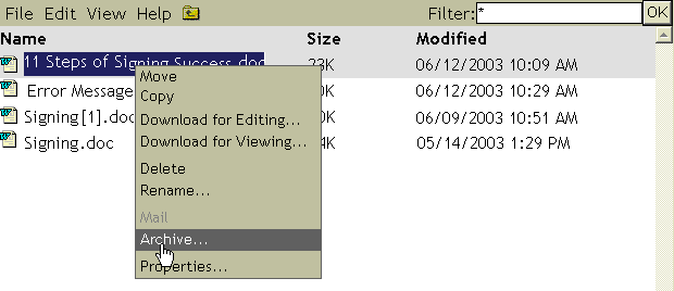 As an example, consider a situation in which a user wants to restore a previous version of a file “11 Steps to Signing Success.doc”. The user begins the search by locating and right-clicking a file in from the NetStorage interface, then clicking Archive, as shown in the following figure. The version set for the file in the guest directory did not contain the version of the file the user needed.