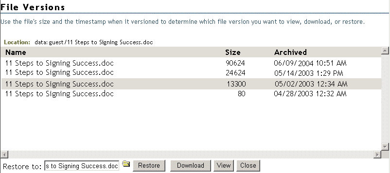 Restore: Click Restore to automatically download and save the selected file version to the path shown in the Restore To field. For security reasons, the file assigned their most recent settings for file system attributes, trustees, and trustee rights.
