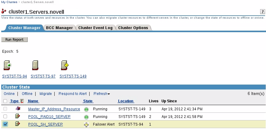 The Cluster Manager page in iManager gives you important information about the status of servers and resources in your cluster.