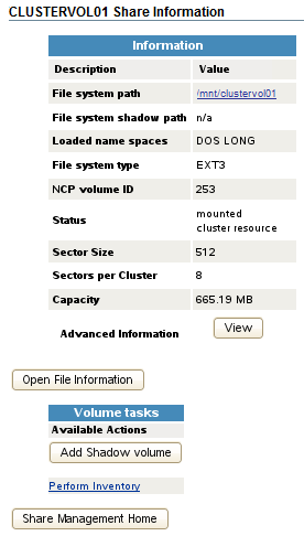 From the drop-down list of available NCP volumes on the server, select the NCP volume that you defined in the load script, such as CLUSTERVOL01. |
