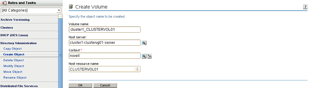 Use the following procedure to create an NCP volume object on the NCP virtual server you created in Section 13.5, Creating a Virtual Server Object for an LVM Volume Group Cluster Resource