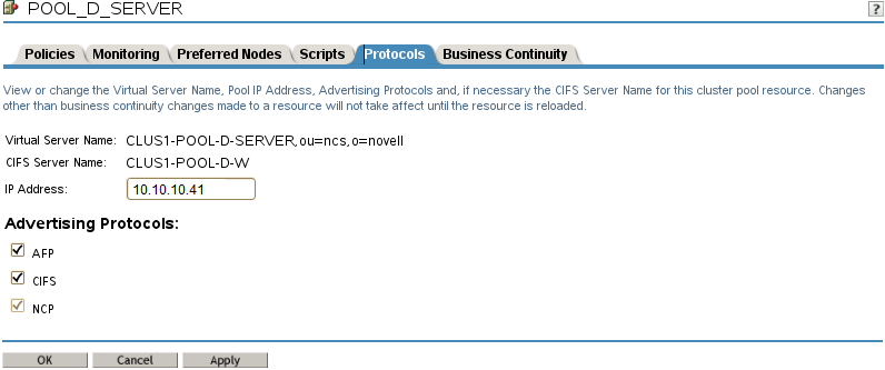You can change the IP address of a pool cluster resource by using the Protocols page in the resource’s Properties in the Clusters plug-in for iManager. Ensure that you take the pool cluster resource offline before attempting to change its IP address. When you save the change, the load, unload, and monitor scripts are automatically updated with the new IP address. It also automatically updates the resource’s IP address that is stored in its NCP Virtual Server object.