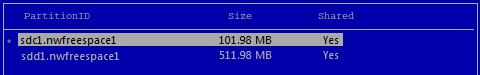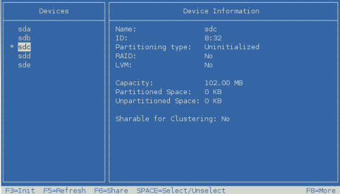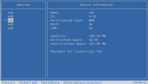 sdc size=102.00MB free=101.98MB format=MSDOS shared=Yes RAID=No sdd size=102.00MB free=101.98MB format=MSDOS shared=Yes RAID=No