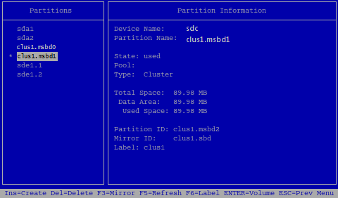 For example, for a cluster named clus1, the mirrored SBD partitions are clus1.msbd0 and clus1.msbd1.