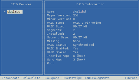 The RAID definition remains for the remaining segment of the mirrored SBD partition. The SBD RAID1 reports that it has one segment.