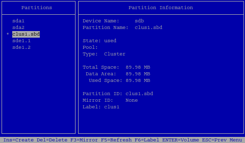 From the list of partitions, select the SBD partition that you want to mirror. The partition is named the same as the cluster with an .sbd extension, such as clus1.sbd.