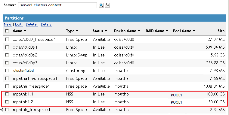 For example, the partitions mpathb1.1 and mpathb1.2 are allocated to POOL1.