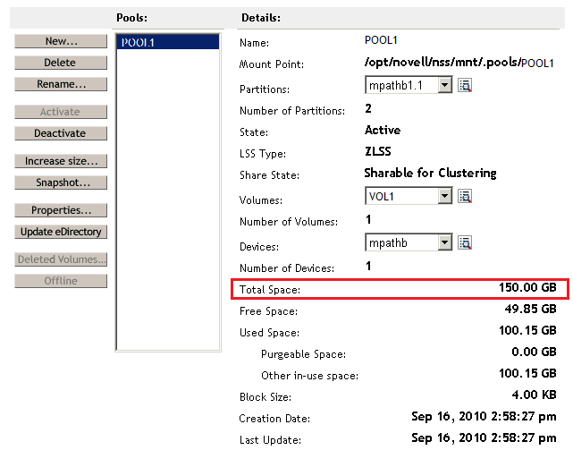 On the Pool page, select the pool, then verify that the Total Space field reports the new size.