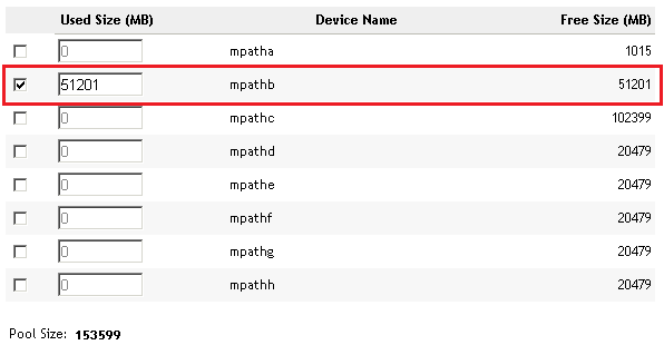 In the list of devices, select the check box for the newly expanded LUN, such as mpathb, then specify the amount of space to add in MB.