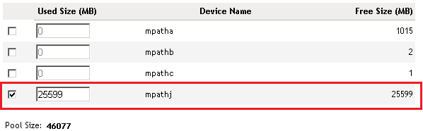 In the list of devices, select the check box for the new LUN, such as mpathj, then specify the amount of space to add in MB.