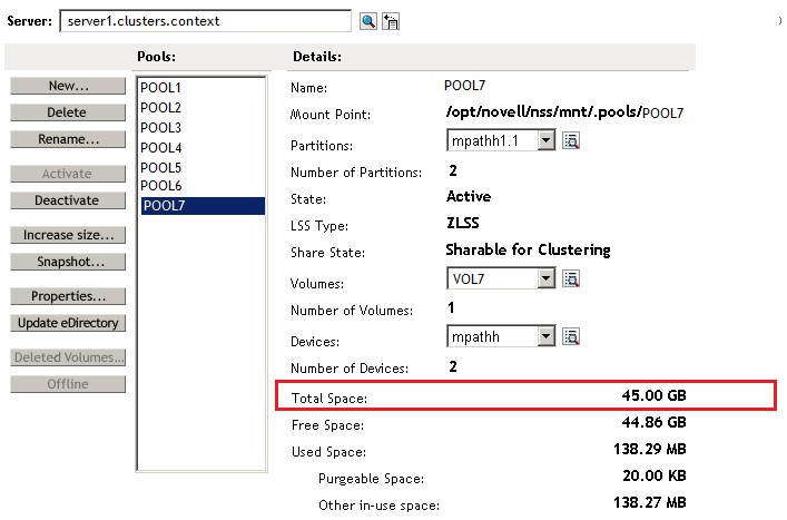 NSS pools are made up of segments of space from one or more devices up to a maximum total size of 8 TB (terabytes). Each device can be up to 2 TB in size if a DOS partitioning scheme is used, or up to 8 TB in size if a GPT partitioning scheme is used. You can expand a pool by adding more space from the same device or from a different shared device. If you extend the size of a LUN device that is currently being used by the pool, you must make the extended size visible to all nodes in the cluster before you add the newly available space to the clustered pool. If you add a new shared LUN device, you must make the device visible to all nodes in the cluster before you add space from the device to the clustered pool.