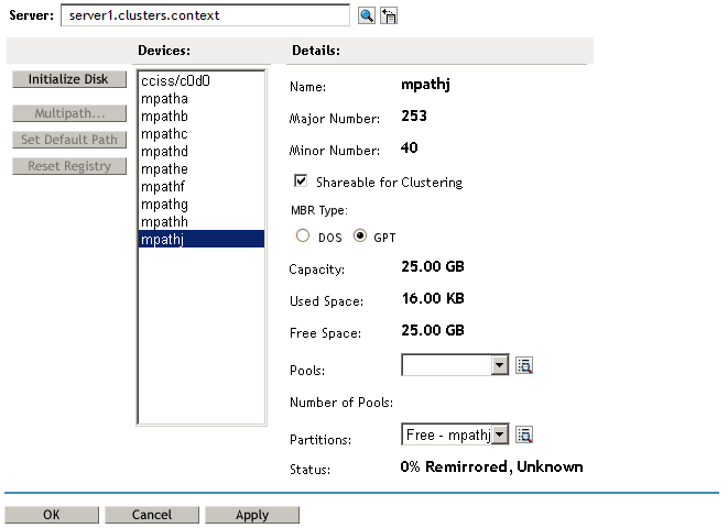 In iManager, initialize the new LUN, then mark it as shareable for clustering: