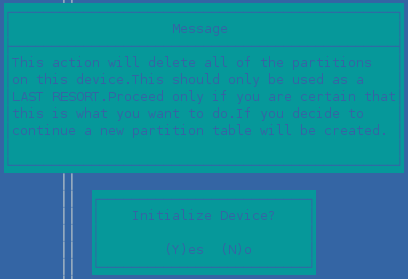 You are prompted to confirm the initialization. If you continue, any existing partitions on the device are deleted, and a new partition table is created.