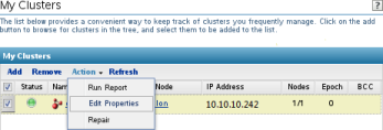 After the clusters connection is made, select the check box next to the cluster, then click Action > Edit Properties to open the Cluster Properties dialog box.