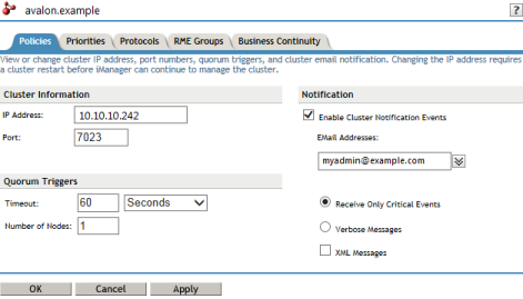 IMPORTANT:After you change the cluster IP address or port number, you must restart Cluster Services, exit iManager, and relaunch iManager before iManager can manage the cluster with the new IP address.