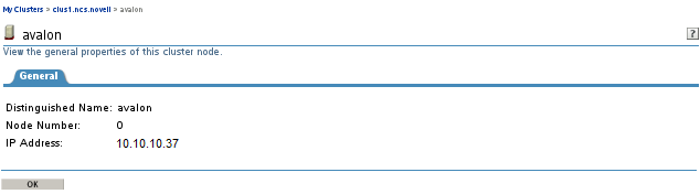 You can view the cluster node number and IP address of the selected node as well as the distinguished name of the Linux Server object.