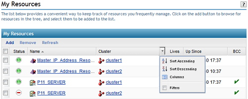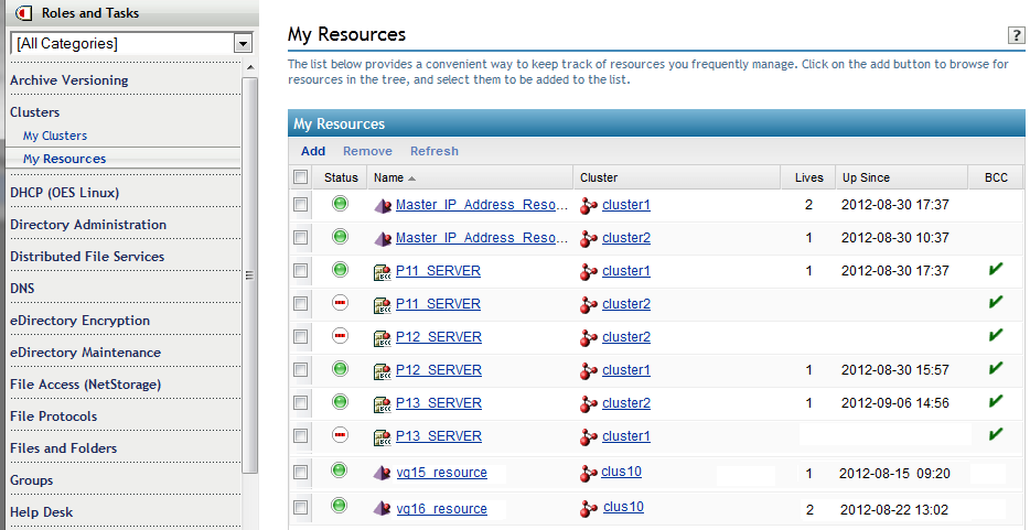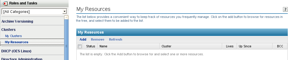 The My Resources page in the Clusters plug-in for iManager allows each cluster administrator to set up a personalized list of cluster resources to manage. This allows an administrator to view at a glance the status of the specified resources. The list persists between the administrator’s logins to the same iManager server.