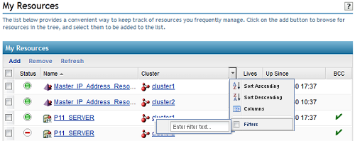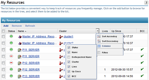 The My Resources page provides menus in the column headings that allow you to personalize the display. You can sort the entries, modify the columns, or filter the entries. Your preferences are saved between logins to iManager.