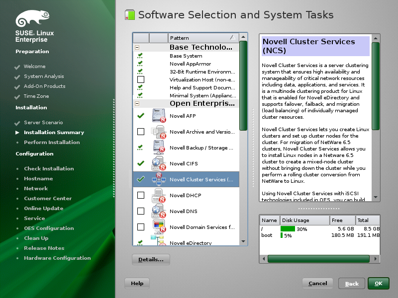 On the Software Selection page under Open Enterprise Server, select Novell Cluster Services and any other compatible OES components that you want to install.