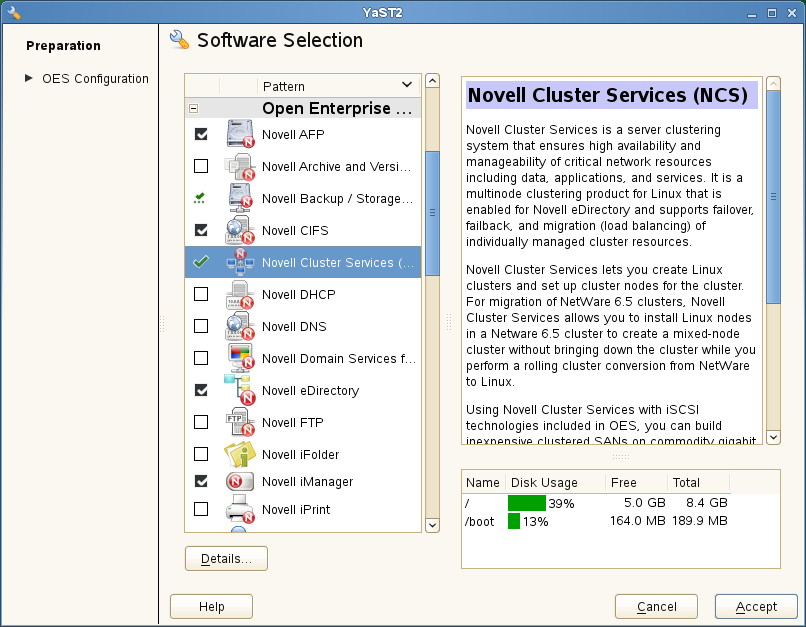 Under Open Enterprise Server, select Novell Cluster Services and any other OES components that you want to install, then click Accept.